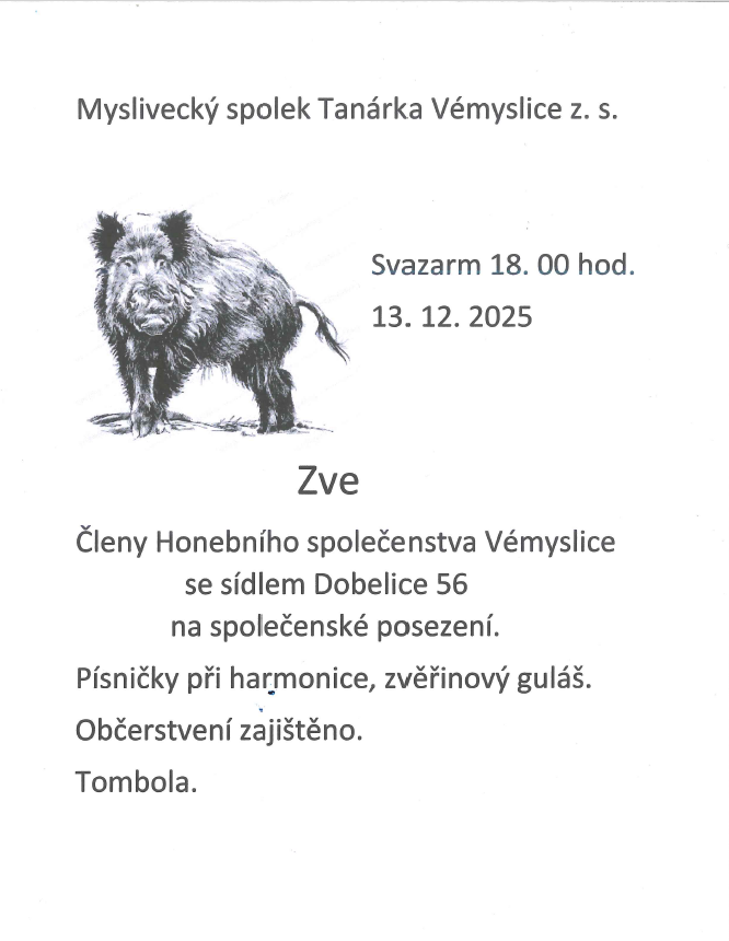 Myslivecký spolek Tanárka Vémyslice z.s.-Pozvánka pro členy Honebního společenstva Vémyslice na společenské posezení